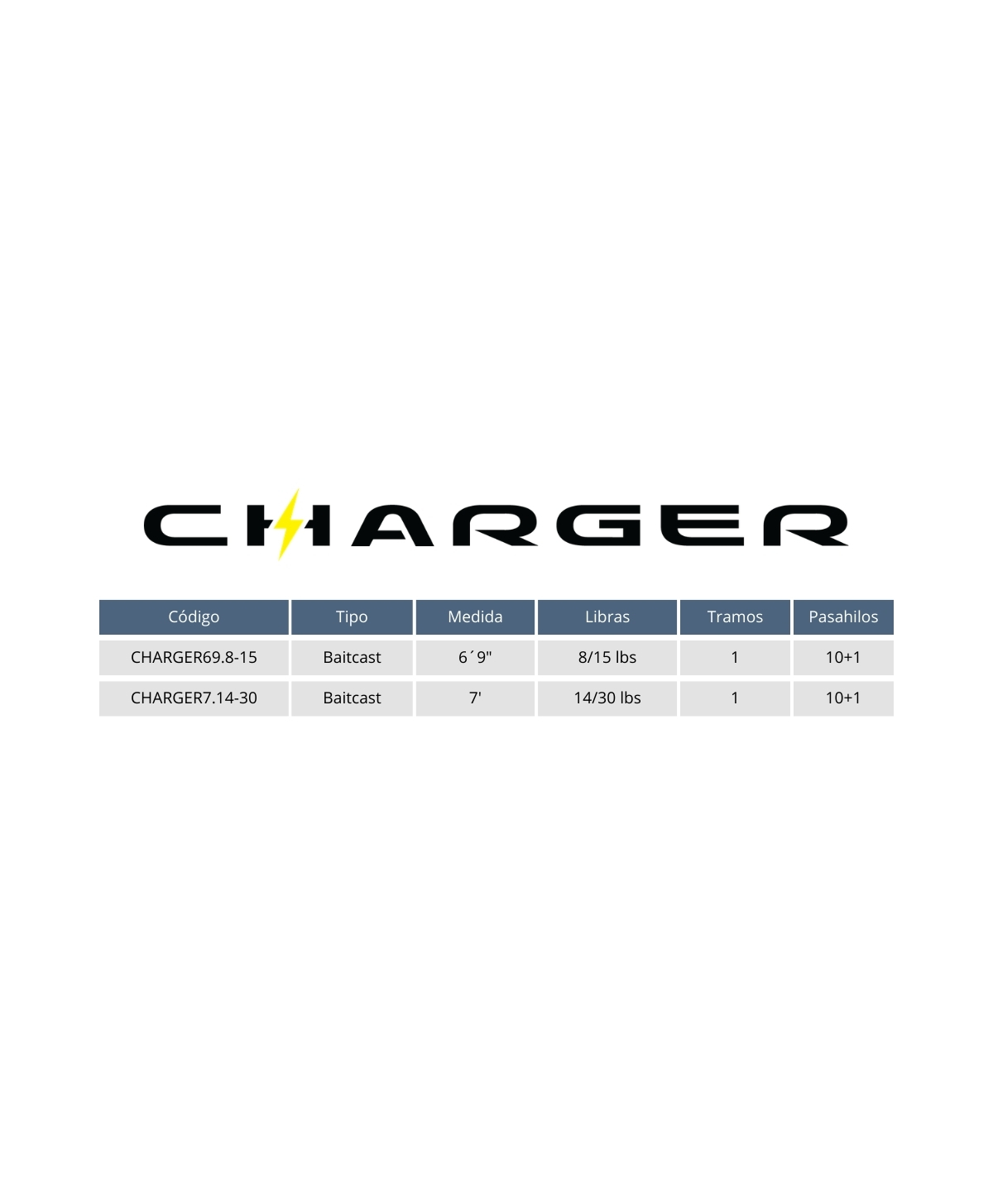 Charger: Performance y personalidad en un tramo. Con su impactante color rojo, está disponible en 6’9” – 8-15 y 7’ -14-30 lbs. Equipada con 10 pasahilos más puntero, garantiza una curva de acción impecable en todo el blank. La versión liviana es perfecta para buscar tarariras y dorados con señuelos, mientras que la más potente tiene la fuerza necesaria para pescar con grandes carnadas. Una caña que no pasa desapercibida.