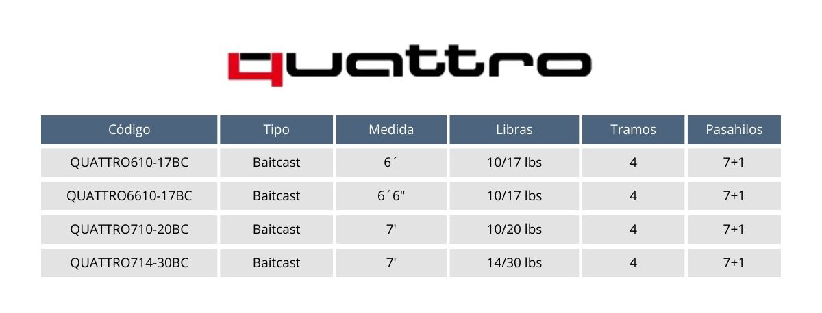 La Quattro está pensada para pescadores que buscan máxima portabilidad sin resignar performance. Perfeccionada durante más de 10 años, esta última generación incorpora grafitos superiores, componentes mejorados y una impactante cosmética en azul opaco. Su diseño en cuatro tramos cortos es ideal para llevarla cómodamente en la mochila o tenerla siempre lista en el baúl del auto. Disponible de 6 a 7 pies (14-30 lbs), es la compañera de viaje definitiva para estar preparado ante cualquier situación de pesca.